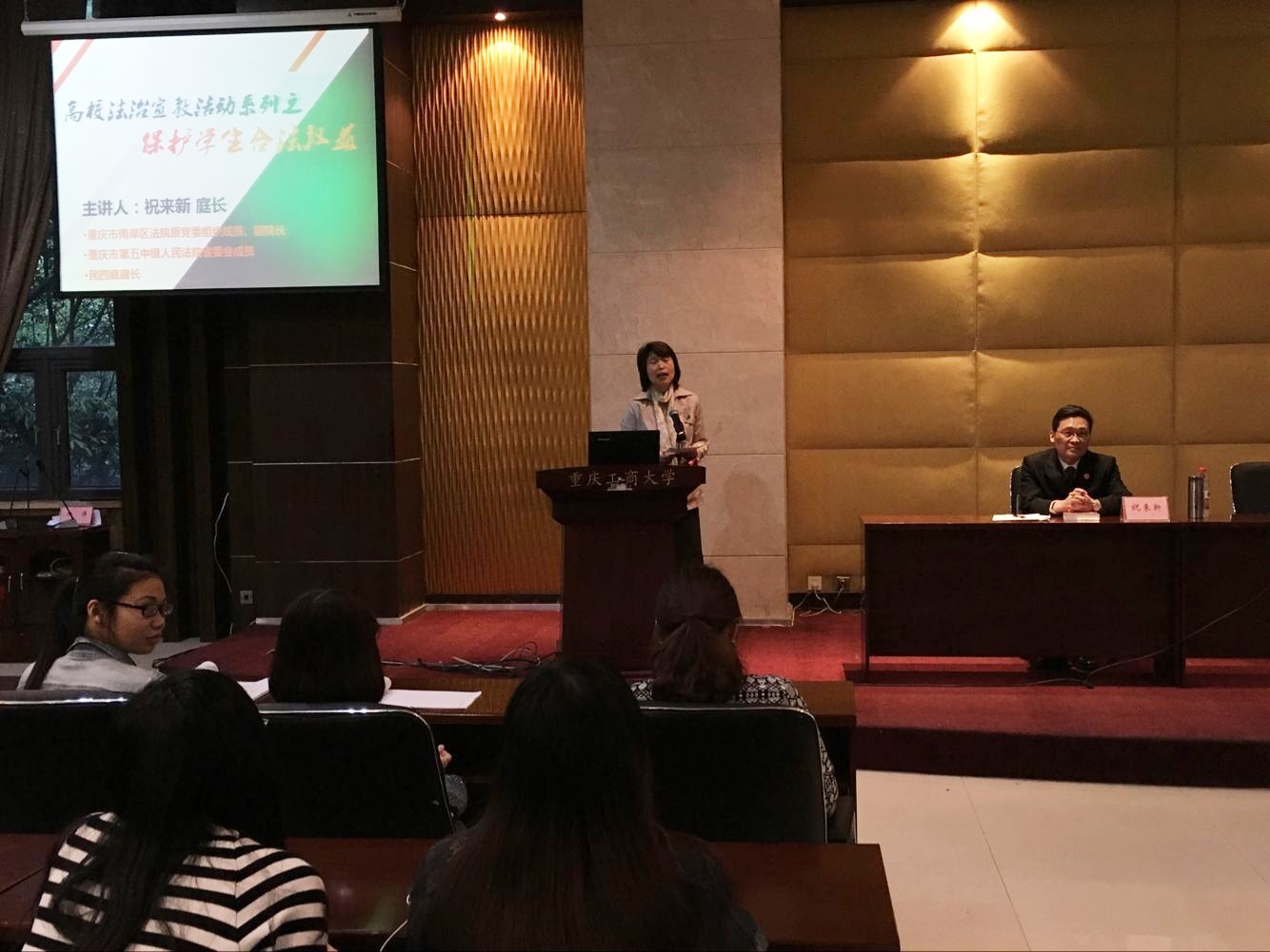 2016年4月26日晚,高校法治宣教活动系列之保护学生合法权益法律讲座在田家炳书院408报告厅成功召开。重庆市南岸区法院原党委组织成员、副院长,重庆市第五中级人民法院省委会成员、民四庭庭长祝来新;原重庆市南岸去法院副院长、原重庆市第五中级人民法院宣教处副处长陈绍惠受邀就大学生就业相关劳动法律问题进行知识宣讲。财政beat365英国官网网站党总支杨萍书记、分团委徐阔书记、校友联络员杨佳妮及校友代表张明佳出席了本次讲座。