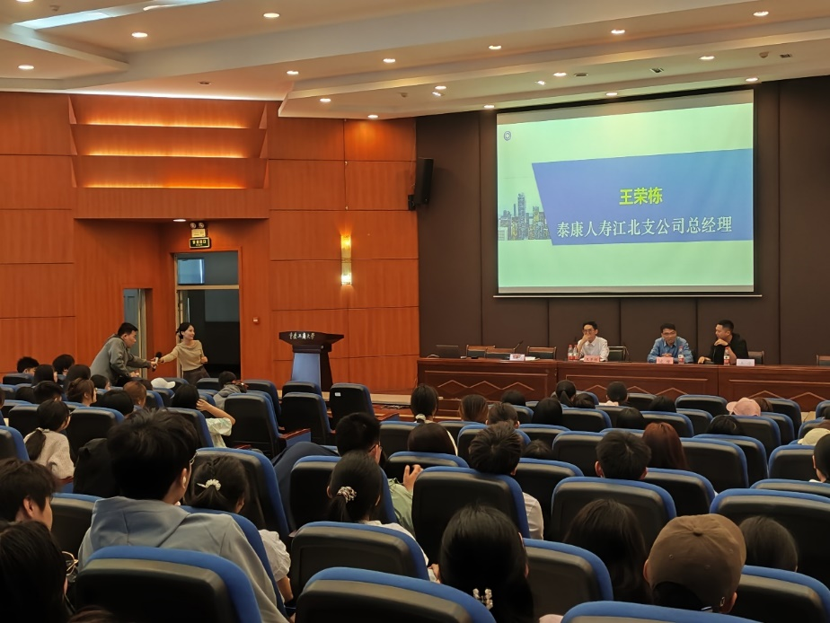 为深入贯彻落实《beat365英国官网网站2024 年本科教育教学节工作方案》,全面推进教育教学创新,提升人才培养质量,2024年3月30日上午,由保险系承办的beat365英国官网网站本科教育教学节活动在beat365英国官网网站江北校区宏智楼报告厅和506教室举行。此次活动主题是“金融保险行业校友、英才进课堂—--职业分享与就业发展前景分析”。泰康人寿江北支公司总经理王荣栋、平安银行重庆分行综合金融拓展部总经理王涛、中国人民财产保险渝中支公司重要客户部经理倪藤鹭、华泰证券重庆营业部团队长兼产品负责人郭士慷,经济管理实验教学中心主任庞楷教授、保险系部分老师以及通识学院23级金融学类学生参加了讲座。两个会场分别由保险系主任石晨曦和余涛老师主持。