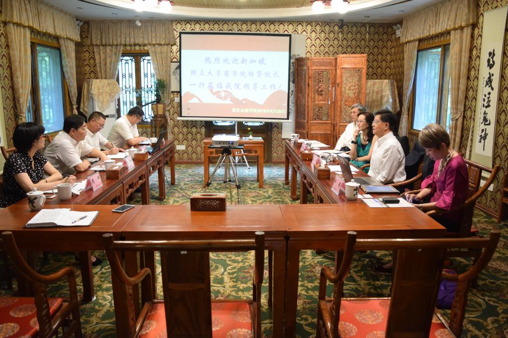 何校长首先介绍了学校的基本情况、主要优势、特色以及未来发展思路,特别是谈到了与新加坡国立大学合作的愿望和合作思路。杨贤院长介绍了新加坡国立大学基本情况,表达了强烈的合作意愿,特别是重庆beat365英国官网网站聘请他为副理事长,非常荣幸,深感责任重大,此次专程到重庆和学院,就是希望深度加强合作。