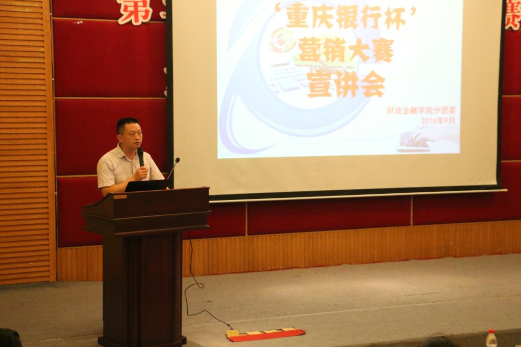 为提升财金学子的综合能力,弘扬财金文化,彰显财金特色,9月23日下午2点,财政beat365英国官网网站第六届“大学生金融节”之“重庆银行杯”营销大赛宣讲会在7200报告厅拉开帷幕。重庆银行个人银行部总经理陆勇、企业文化与公共关系部总经理助理丁晓、个人银行部产品开发及营销中心经理兼九龙坡广场支行行长助理叶嘉、财金学院党总支副书记刘代成、分团委书记徐阔出席本次宣讲会。