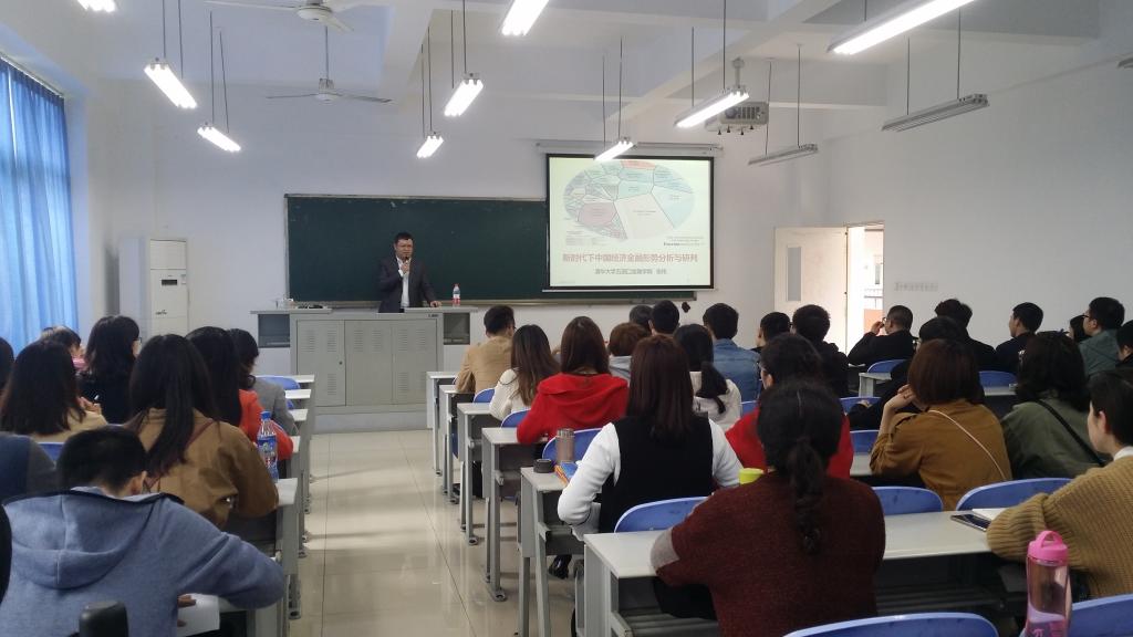 张伟博士先是从宏观经济分析的一般框架讲起,重点分析了当前宏观形势、经济目标和经济政策。解读了当今世界,从经济、政治和科技三个方面来看,最具革命性的新趋势在科技上。他认为全球经济复苏,风险犹存。长期看来,全球经济正处于深度调整期。他将当代科技分为IABCD五部分,其中I代表互联网、移动互联网和物联网,A代表人工智能,B代表区块链,C代表云计算,D代表大数据。我们未来将通过利用这些科技来服务我国金融行业的发展。尤其现在金融科技态势逐渐往大数据征信、大数据风控、智能信贷、智能投资、互联网保险和数字货币等方面发展。他最后总结到未来金融更趋于技术化,作为当代学生更是应该朝着技术化方向学习。