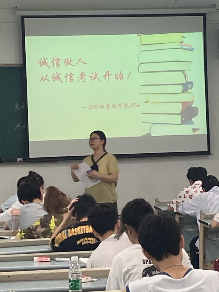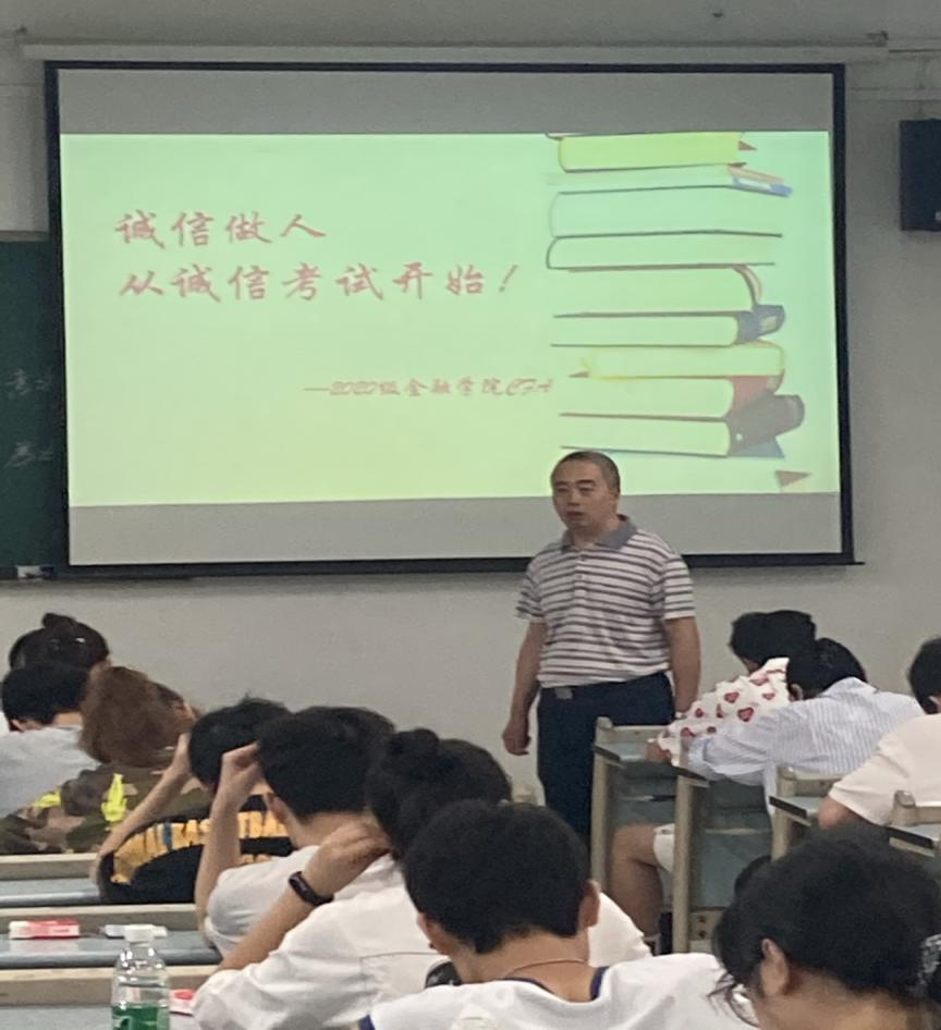 7月2日上午9:00,beat365英国官网网站2020级CFA专业54名同学自愿申请在兰花湖校区20309教室践行了以“诚信做人,从诚信考试开始”为主题的《金融学》课程的“免监考”诚信考试。副校长李国军、教务处处长骆东奇、党委学工部副部长尹建平到场巡考。