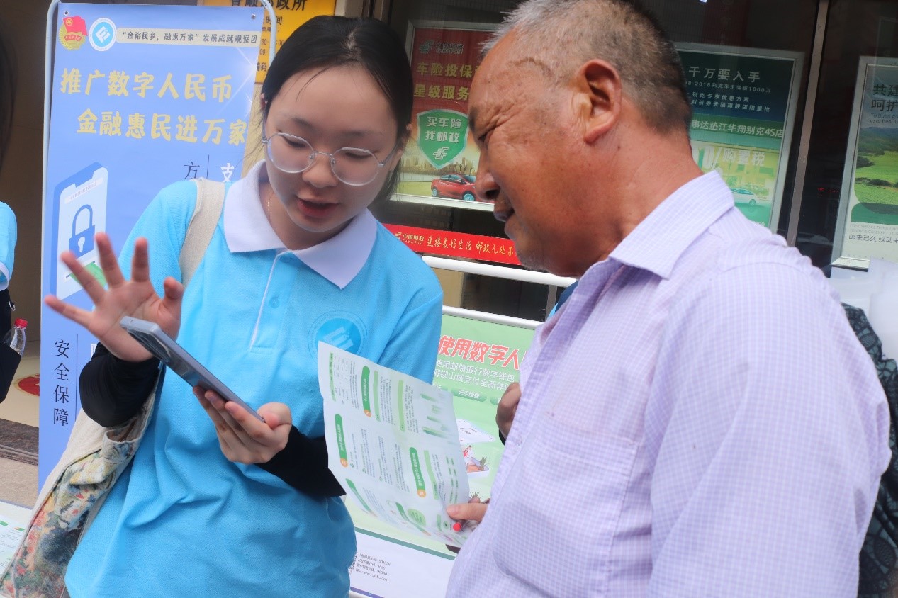 “什么是数字人民币?”“数字人民币跟微信、支付宝有什么不同?”“数字人民币怎么使用?”在推广过程中,前来咨询的居民不断提出各种疑问。实践团成员一边结合中国邮政储蓄银行专门制作的数字人民币宣传手册,讲解数字人民币是中国法定货币,与实物人民币等价,且具有安全、实时到账、无需网络、无手续费等特点,一边用手机演示数字人民币app的安装、注册、绑定、充值等操作,展示数字人民币的支付页面,让居民更直观地认识数字人民币。还有实践团成员分享自己使用数字人民币购买物资时参与满减优惠的事例,激发居民使用数字人民币的主动性和积极性。面对部分居民的半信半疑,实践团成员现场播放全国各试点城市推广数字人民币的相关视频和新闻,也积极引导居民通过网络多多关注数字人民币相关信息,参与到这一金融惠民服务中来。