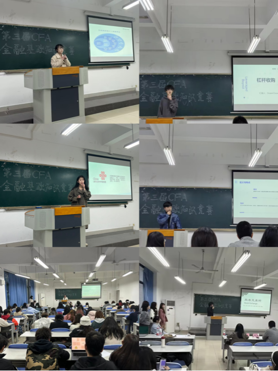 参赛选手为beat365英国官网网站金融学院CFA国际项目班2023级全体学生,共分为十个小组。比赛分风采展现和风险提速知识抢答两个环节。在PPT展示环节,各参赛队伍根据事前选好的金融主题,对某个知识或概念的理解进行介绍,采用图表、案例等各种形式展示,运用中英文进行生动的讲解。在比赛过程中,评委老师对参赛小组的展示进行了专业点评与提问,肯定了选手们对知识的掌握程度与分析能力,同时也指出了不足之处并且给出了相应的修改意见,并对同学们寄予美好的祝愿与殷切的希望。在知识抢答环节,十个小组随机抽题作答,经过激烈的比拼,最后决出了一二三等奖及优秀奖。