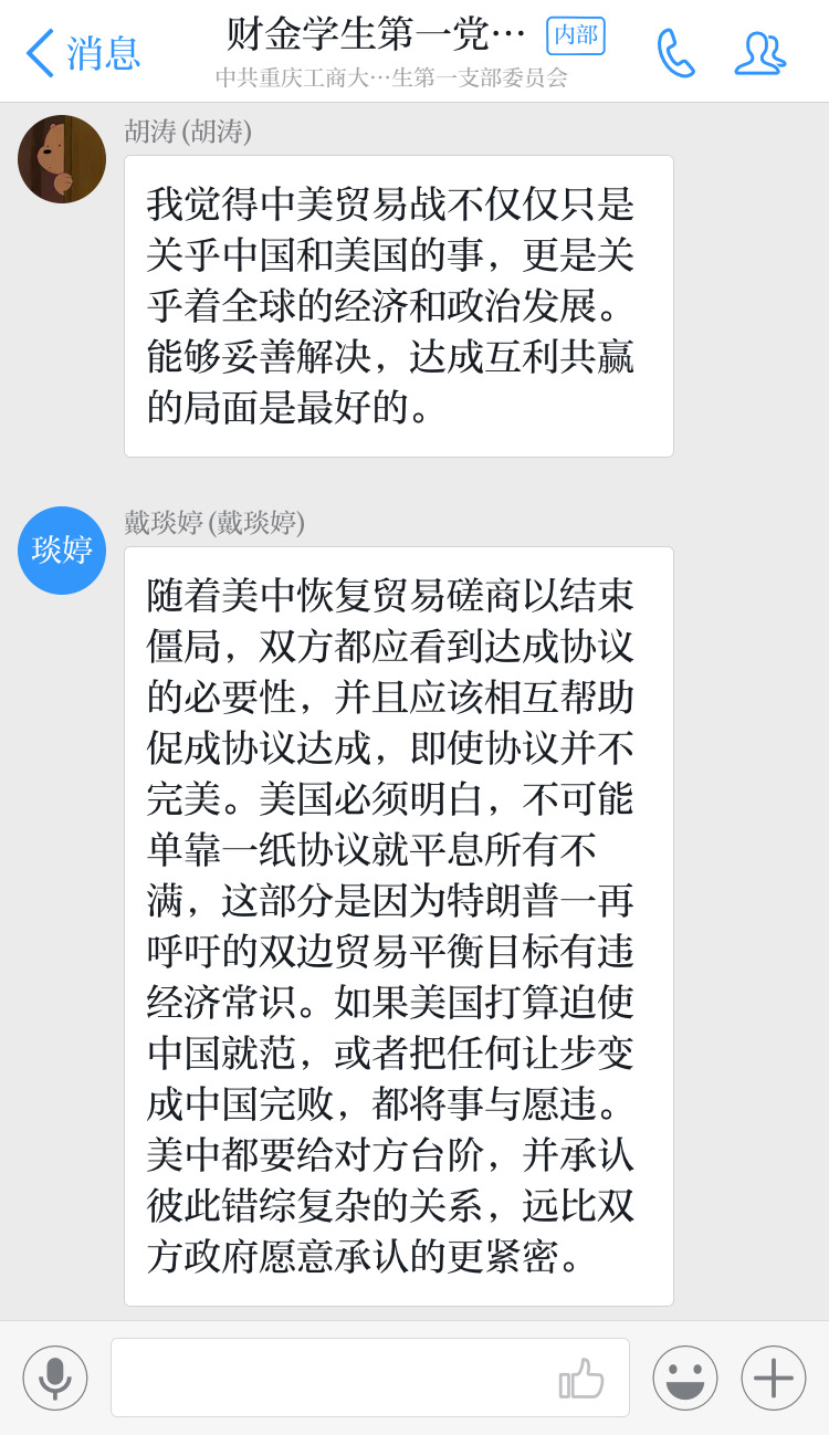 2019年2月15日,财金学生第一党支部组织全体党员进行了寒假第一次交流学习。本次学习由赵利国同志主持,支部全体党员同志参与。交流学习内容包括:1.继续深入学习习近平新时代中国特色社会主义思想和党的十九大精神,重点学习习近平总书记在庆祝改革开放40周年大会上的重要讲话2.由黄琼苇同志分享并简单介绍热点新闻:“新一轮中美贸易战高级别磋商在京开幕”。