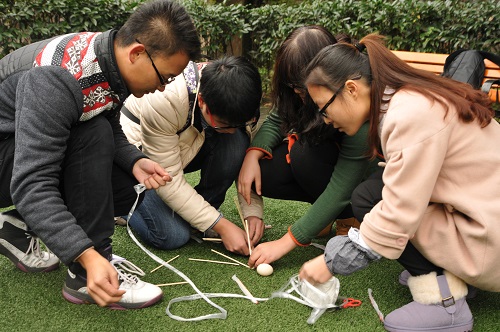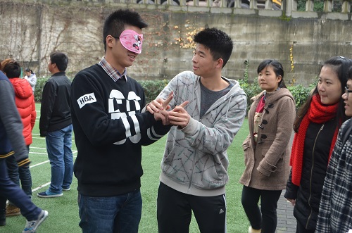活动在张老师的主持下顺利拉开帷幕,取队名、画队旗、想口号,在“破冰”环节中,小组队员打破陌生,熟悉之时快速磨合,四个小组风格迥异的风采展示所表现出的活力激情犹如冬日暖阳。接力传话、纸牌叠塔、高空坠蛋,在一个又一个极富挑战的趣味活动下,大家的分工进一步明确,合作更加协调。“穿越雷区”时一次又一次的失败没能击倒大家,队员们在相互鼓励中重拾信心,利用团队的力量突破困难,走到最后。在“盲人与哑巴”中,失去语言和视觉组员们,在活动的进行中建立信任,在默契配合中顺利过关。