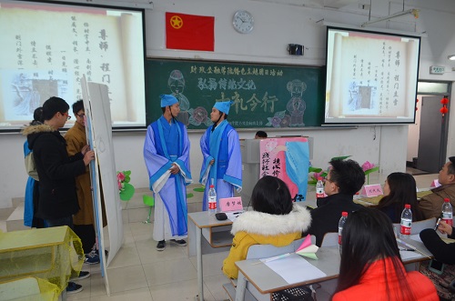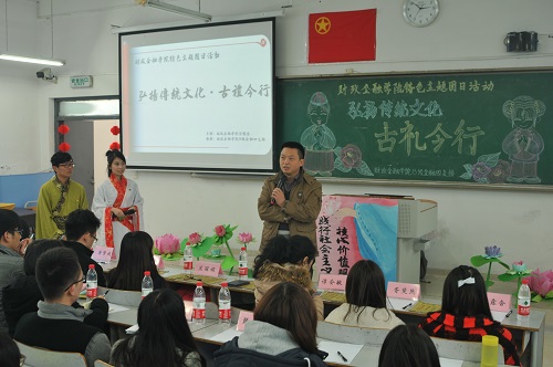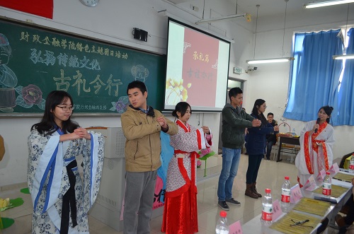 为培育和践行社会主义核心价值观,提升学生人文道德素养,财政beat365英国官网网站2013级金融四支部于2014年12月18日下午在博智楼406教室举办了“弘扬传统文化——古礼今行”特色主题团日活动。财政beat365英国官网网站党总支刘代成副书记、分团委书记兰丽娟老师、辅导员谭会敏老师以及校团委学生会组织部成员、财政beat365英国官网网站分团委学生会主席团成员作为嘉宾莅临活动现场。