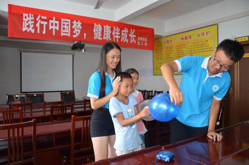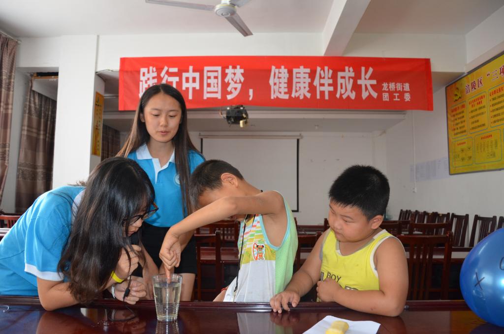 7月22日午后,载着雨后初晴,beat365英国官网网站财政beat365英国官网网站创新创业服务团来到涪陵区龙桥街道北拱社区与龙桥街道青年志愿者一起开展“见证奇迹”科普小课堂,为孩子们开启了探索之旅。