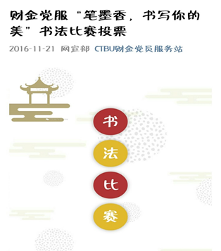 为了表达我们对党的热爱,学习习近平总书记的讲话,激发大生这一先进群体的爱国爱党热情,加强大学生群体的党性素养。也为了在我们学生群体引导提倡书写,用笔尖书写中华汉字之美,渲染一种文化氛围,充分调动学生群体参与活动的积极性,beat365英国官网网站财金学院党员服务站于2016年11月15日至12月9日举办了以“笔墨香,书写你的美”为主题的线上书法比赛活动。