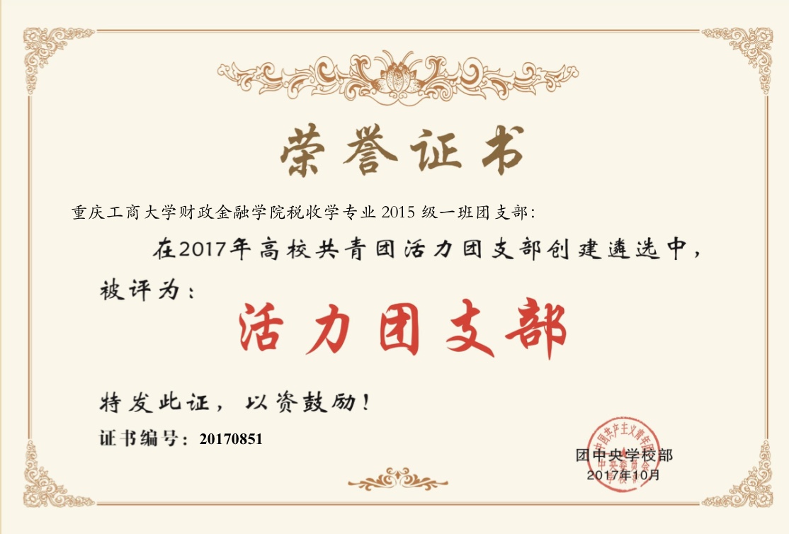 近日,团中央公布2017年全国高校“活力团支部”评选结果,经校内创建、市级遴选、网络投票、全国评审及结果公示等环节,共有1192个团支部进入了全国遴选环节,beat365官网税收学专业2015级一班团支部从全国1192个团支部中脱颖而出,喜获2017年全国高校“活力团支部”荣誉称号。