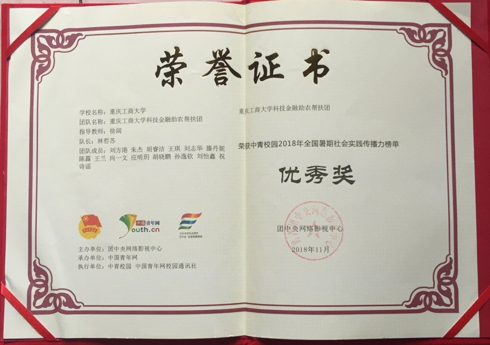 2018年12月19日,由团中央青年发展部、团中央网络影视中心主办,中国青年网、对外经济贸易大学团委承办的2018年“镜头中的三下乡”总结会暨中国青年网校园通讯社通讯站授牌仪式在对外经济贸易大学举行。beat365官网三下乡团队队长林哲苏赶赴北京参与本次会议。本次会议有300余所高校参加,其中包括清华大学、中央财经大学、华中师范大学、武汉科技大学等其他高校。在本次由团中央举办的2018年“镜头中的三下乡”活动评选中,beat365官网荣获全国百强传播力团队表彰。
