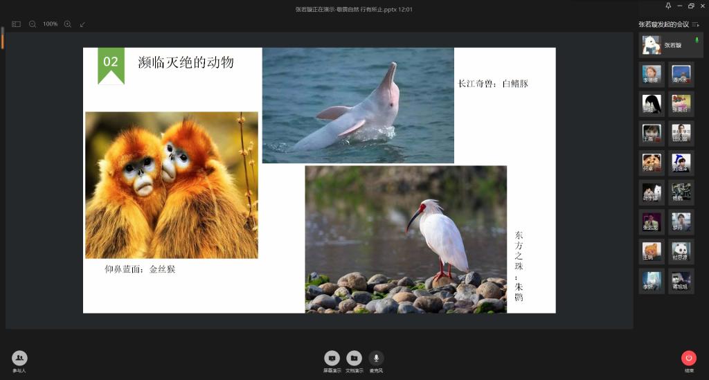 培训会开始后,主持人张若璇简要介绍了本次新冠肺炎疫情基本情况,分享了第十三届全国人民代表大会常务委员会于2020年2月24日通过的《关于全面禁止非法野生动物交易、革除滥食野生动物陋习、切实保障人民群众生命健康安全的决定》。并由此引出接下来的知识科普环节,在本环节中,会议讲解者对相关内容展开介绍,带领同学们一起了解了当前生态环境状况、造成多种动物濒危灭绝的原因以及如何保护野生动物和生态环境。培训会中间穿插着关于此次新冠肺炎疫情的问答环节,团干们积极参与。会议的最后为讨论环节,团干们踊跃发言,交流自己对于此次学习的收获和疫情期间自己的感受。