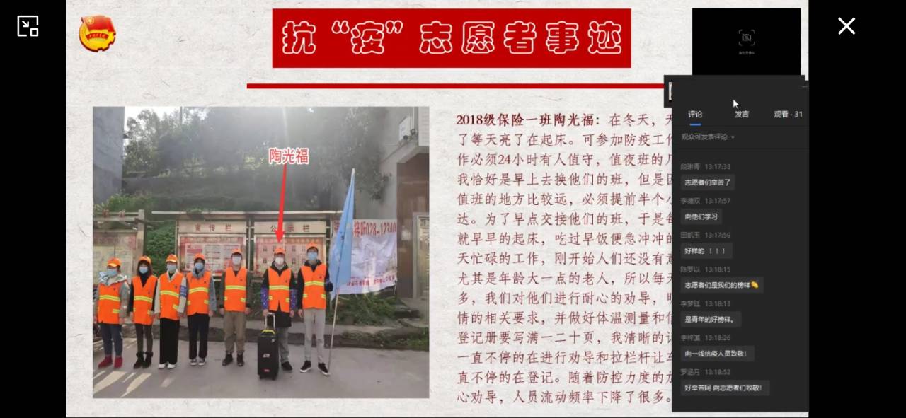 本次活动的主要内容为分享奋战在抗“疫”前线的财金学子故事,身体力行践行社会主义核心价值观。活动伊始,主持人分享了2018级保险一班陶光福的抗“疫”故事。陶光福说:“在冬天天气比较冷,我习惯了等天亮了再起床。但参加防疫工作之后,为了早点接替那些值夜班的民兵叔叔,我每天很早就起来。吃过早饭就赶往卡点进行志愿服务”陶光福每天奔波于家里和卡点之间,对过往人员进行劝导,告知他们政府的相关要求,并对他们进行体温测量与登记。作为财金学子的一员,2018级财政二班朱媛媛、沈玥,在疫情期间加入“中国-意大利抗疫物资信息沟通渠道”团队,为远在地球另一端的意大利人民送去中国学生的温暖与祝福。