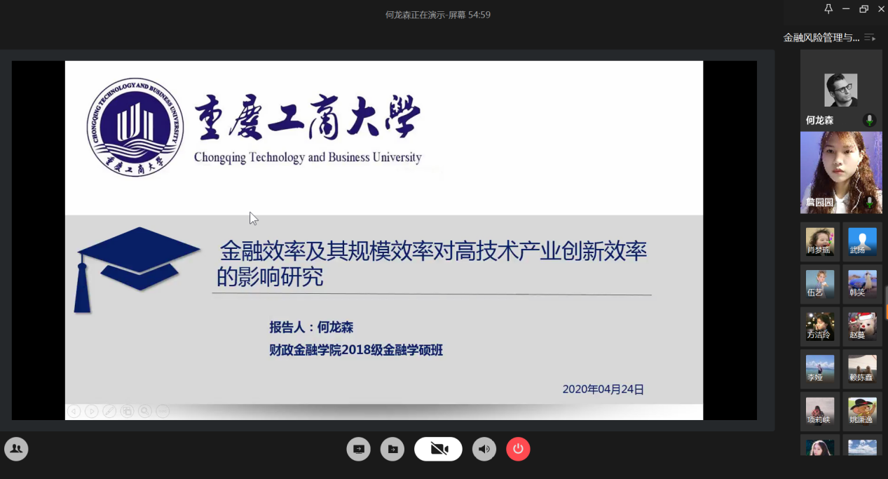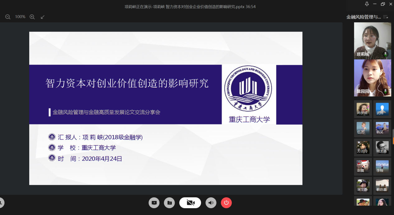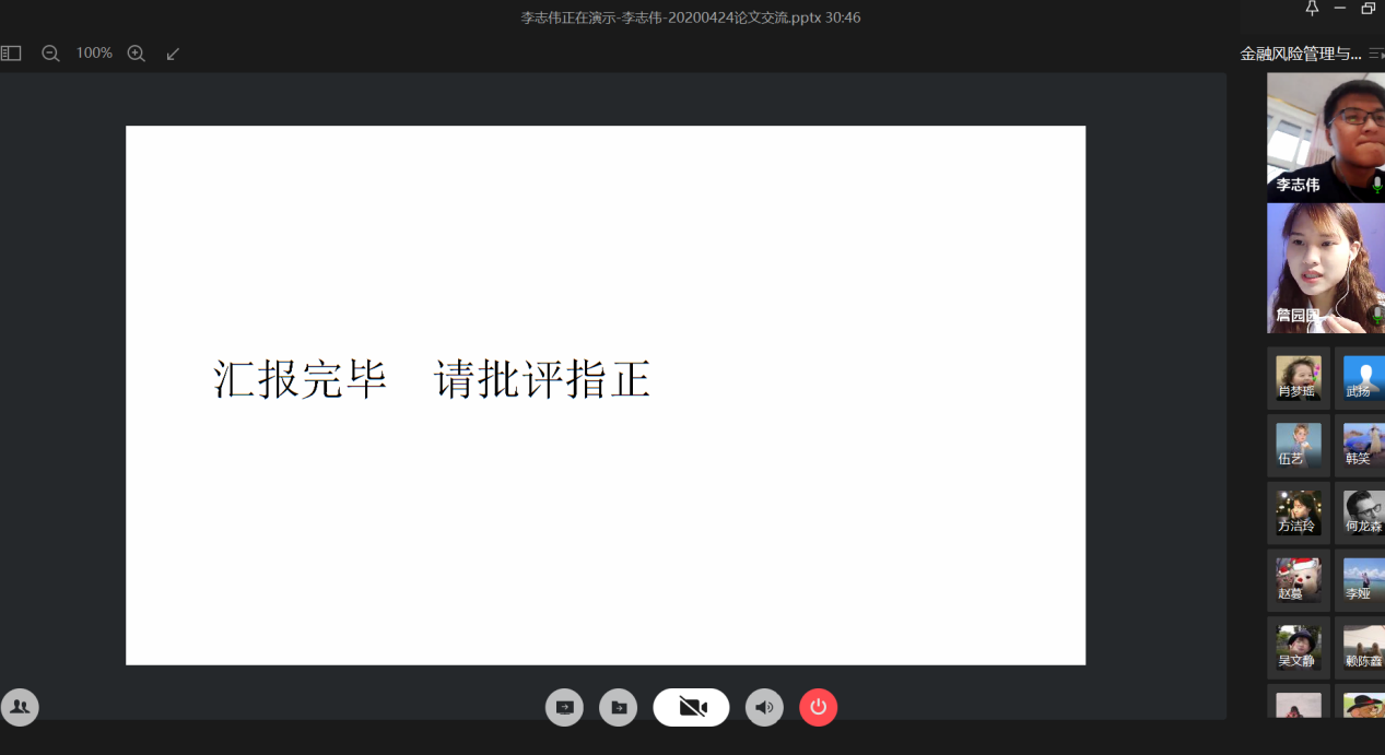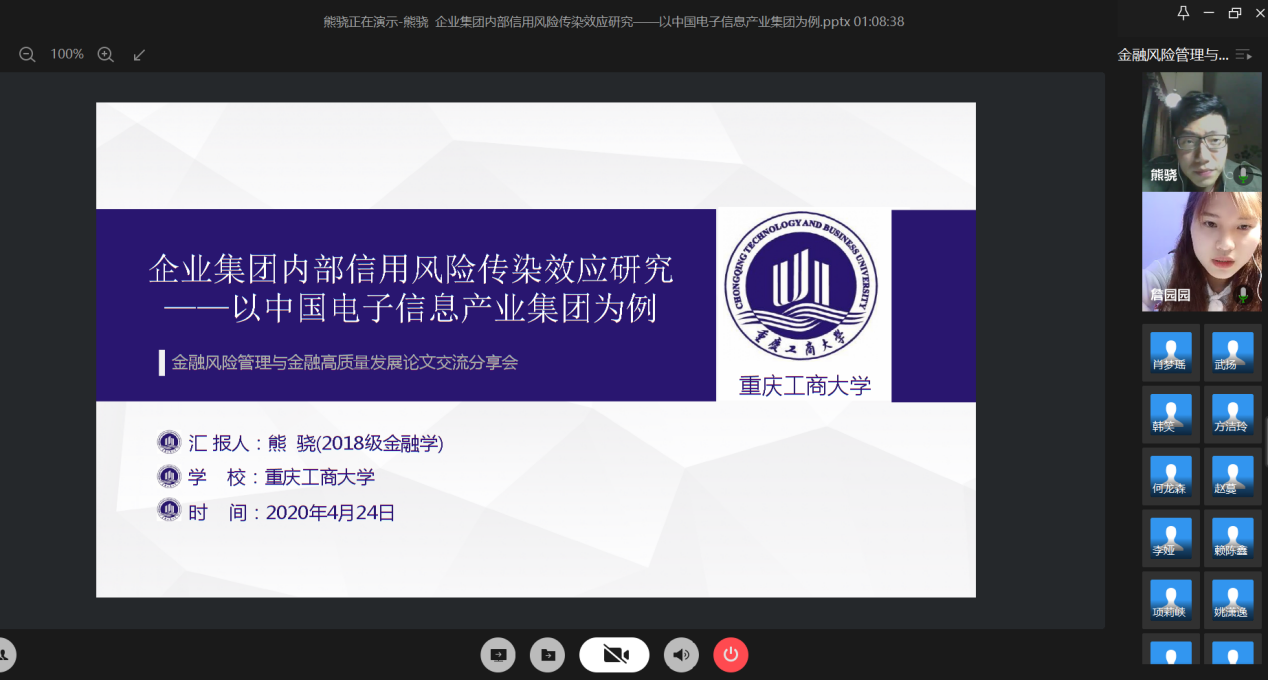 4月24日晚上,财政beat365英国官网网站研究生分会通过腾讯会议成功举办了“金融风险管理与高质量发现”论文交流会。本次交流会由研分会的文体部部长詹园园主持,18级金融学硕的李志伟、项莉峡、何龙森、熊骁四位同学分享了他们的论文框架及论文写作经验。