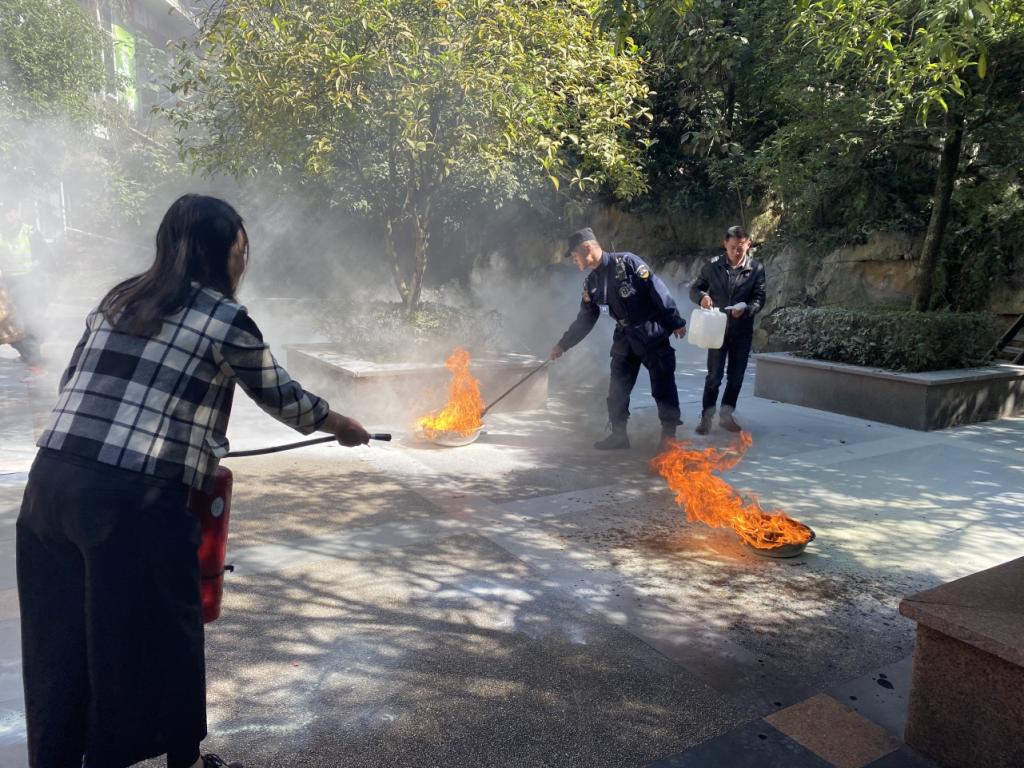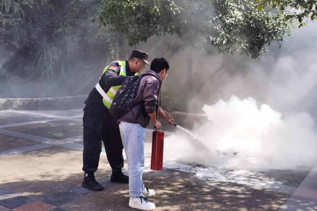 (图为学生和老师体验使用灭火器)