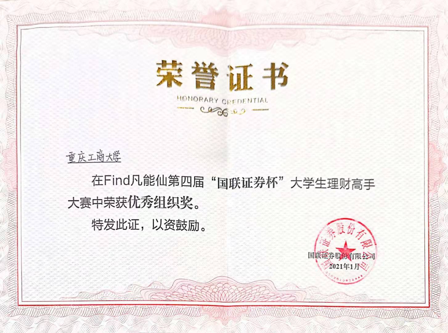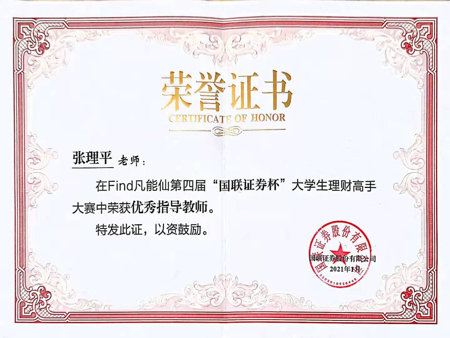 2021年1月10日,第四届“国联证券杯”-Find“凡能仙”大学生理财高手大赛决赛暨颁奖仪式圆满落幕,beat365英国官网网站代表队荣获“优秀组织奖”。金融工程专业张理平老师荣获“优秀指导教师奖”。在基金理财个人赛中,beat365官网蒋涵月获得“二等奖”,杨松获得“三等奖”,寇力元,许梦茹等同学荣获“优秀奖”。