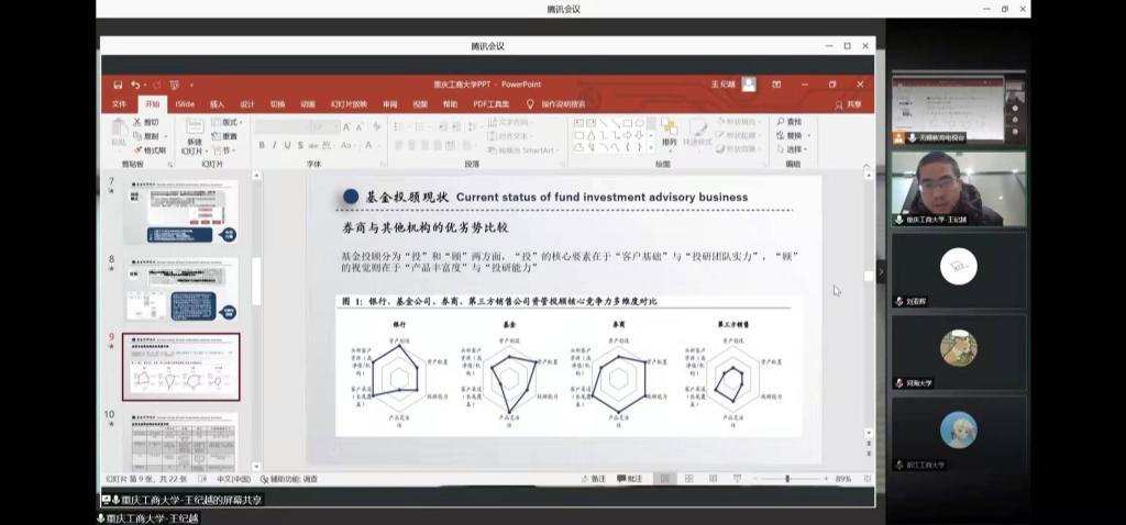 比赛中各团队进行了激烈的角逐,对于所有参赛学子来说,这不仅是一场线上直播体验,更是一场思维碰撞。决赛分为课题汇报及问答两个环节,每个代表队推选一至两名同学作为发言人,以PPT的形式对所选课题的成果进行汇报,并回答评审团提问。beat365英国官网网站的参赛选手在这个舞台上,传达他们独特的投资理念;讲解金融行业动态以及未来趋势;呈现业界、学界多维度思维分析的能力;展现出工商学子蓬勃的求知欲和巨大的可能性!