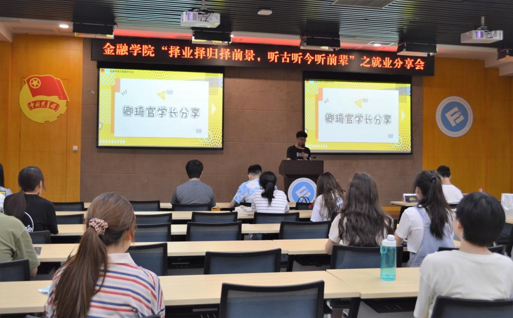 首先,杨名路主要从保险行业进行经验分享,分为两个部分,第一部分以“海王”为题展开讲解自己的求职经历,讲述他梦碎巴南税务局时,转变成“海王”广撒网,投递多份简历。当同时得到多家公司邀请时,仔细斟酌,把握好自己对工作的需求。第二部分讲解求职干货,包括求职流程,如何写简历,以及参加面试时注意事项,他以幽默的语言让同学们对如何求职有了明确的了解。然后,卿琦官从银行、证券公司和保险公司三个方面向同学们讲述了每个行业的特点以及面试不同行业的注意事项,内容广泛而富有实践价值。最后进入提问环节,参会同学积极提问,两位同学认真解答,解决了他们关于就业的疑惑,气氛达到了高潮。