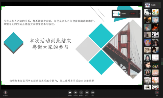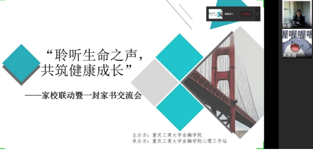 beat365英国官网网站 “聆听生命之声,共筑健康成长”暨一封家书家校联动交流会于2021年10月10日下午14:00通过企业微信线上平台顺利举办。此次活动以引导学生撰写一封家书的形式,搭建起大学生与父母之间的沟通桥梁,交流聆听彼此的心声,帮助大学生心理健康成长。