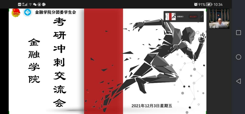 王建明书记致辞,希望同学们在冲刺阶段努力学习的同时也要注意身体健康,保持良好的复习状态,奋战到底,预祝考研成功。在分享阶段,特别邀请到2021届考研成功的优秀校友为同学们分享考研冲刺阶段的注意事项和具体安排。现就读于重庆大学的占志炎同学就重庆大学考研之旅做了分享,指出各科目的复习方向和方法,强调英语需天天练习保持语感,数学刷题熟悉题型,专业课重温重点;他提醒大家备战过程中要劳逸结合,注意心态,鼓励同学们“每个优秀的人,都有一段沉默的时光,那段时光是付出了很多努力,却得不到结果的日子,我们把它叫扎根。”张媛媛同学则分享了本校的考研经验,同样针对最后的冲刺阶段提出复习方法和侧重点,提醒同学们放平心态,正常应对。现就读于首都经济贸易大学的田乙衫同学则指出每个人的学习习惯不同,适用的资料也会有所差异,要根据自身情况选择匹配的学习资料及复习方法,保持良好的作息和状态。在互动环节后,余新副书记总结,她再次强调了冲刺阶段要劳逸结合,希望同学们保持四心:“决心”、“耐心”、“恒心”、“信心”,并预祝同学们取得成功,来年为下一届学弟学妹分享成功经验。