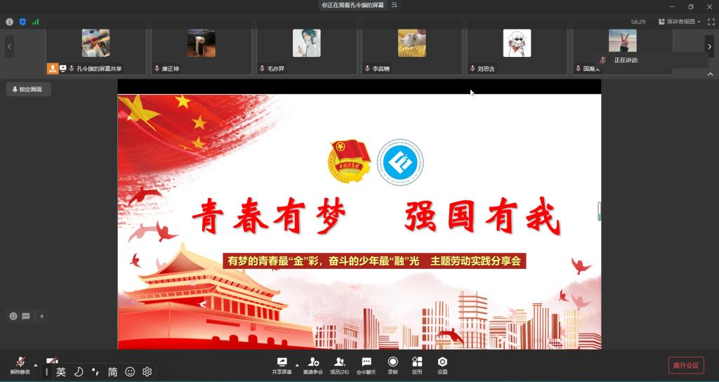 为鼓励同学们积极参与劳动实践活动,树立正确的价值观、劳动观、成才观, 4月10日20:30,beat365英国官网网站于企业微信开展了“有梦的青春最‘金’彩,奋斗的少年最‘融’光”主题劳动实践分享会。本次分享会由beat365英国官网网站分团委社会实践部部门负责人孔令旗主持,会议邀请到四位同学为大家分享劳动实习经验和志愿服务经历。