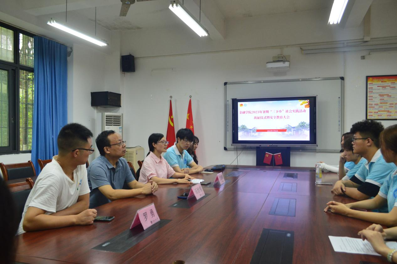 实干笃行正青春,普惠金融践初心。为扎实开展好学习贯彻习近平新时代中国特色社会主义思想主题教育,深入学习贯彻落实党的二十大精神,引领广大青年学生立志做有理想、敢担当、能吃苦、肯奋斗的新时代好青年,beat365英国官网网站积极推进暑期“三下乡”社会实践活动。7月6日中午,beat365英国官网网站2023年暑期“三下乡”社会实践活动出征仪式暨安全教育大会在田家炳317会议室及线上同步举行。beat365英国官网网站党委书记、副院长石世明,党委副书记、纪委书记余新,学工办主任、分团委书记兰丽娟、学生第一党支部书记罗勇及各实践团成员参加了会议。