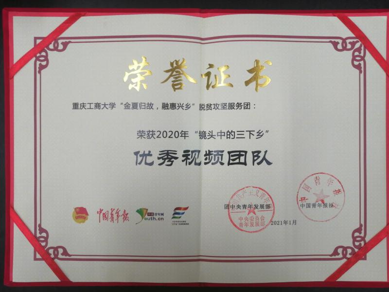 2020年11月23日,团中央青年发展部、中国青年报、中国青年网共同举办2020年全国大中专学生志愿者暑期“三下乡”社会实践“镜头中的三下乡”成果遴活动结果公示,beat365官网暑期“三下乡”社会实践团队——“金夏归故,融惠兴乡”脱贫攻坚服务团荣获“全国优秀视频团队”荣誉称号。